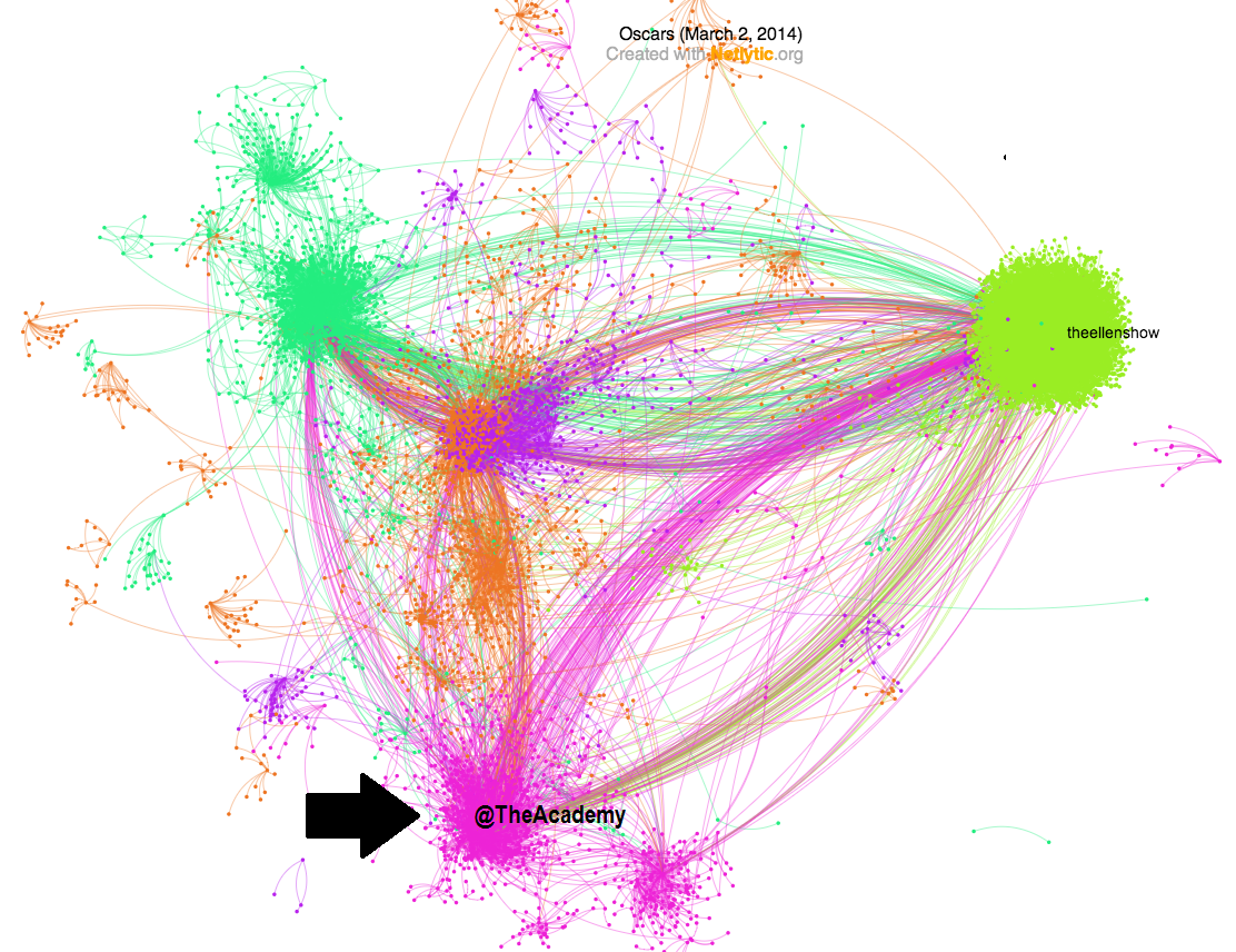 Another notable cluster category in the network analysis is the one surrounding @TheAcademy. As demonstrated in Figure 4, thousands of twitter users were interacting directly with this twitter account. Since @TheAcademy is the official account for the Academy of Motion Pictures Arts & Sciences, the account was tweeting live updates on the Oscar winners and event’s happenings as it unfolded. This prompted twitter users to engage back through retweets and mentions. Another possible explanation to this condensed cluster around the Academy could be attributed to the #MyOscarPhoto campaign that ran in conjunction with the Oscars. The campaign was an example of the latest User-Generated Content (UGC) stunts that companies are increasingly promoting to create memorable interactive experiences. The campaign’s premise encouraged viewers to follow @TheAcademy, tweet their photos to be featured next to a Hollywood celebrity then watch the TV broadcast on whether they made the cut or not. This is a perfect example of the phenomenon of second screen experience where the line between online and traditional media is increasingly blurred as more people are multitasking and using both mediums to foster a holistic experience around an event.