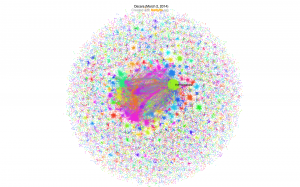 Also the Netlytic network visualizer revealed that even with a relatively small sample of tweets, we were able to find some interesting patterns in data. For example, in the case of tweets about Oscars, although the overwhelming majority of the tweets on this topic (~3 million) were simple retweets of the Ellen’s selfie; the network representation of the data shows that there are other topics discussed around this event such as tweets about the MyOscarPhoto campaign and discussions around the fashion and style of celebrities during the Oscars (see above).Â