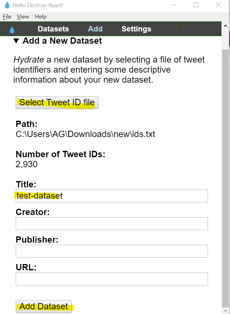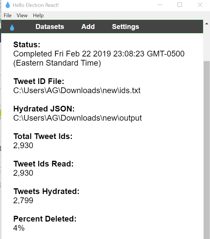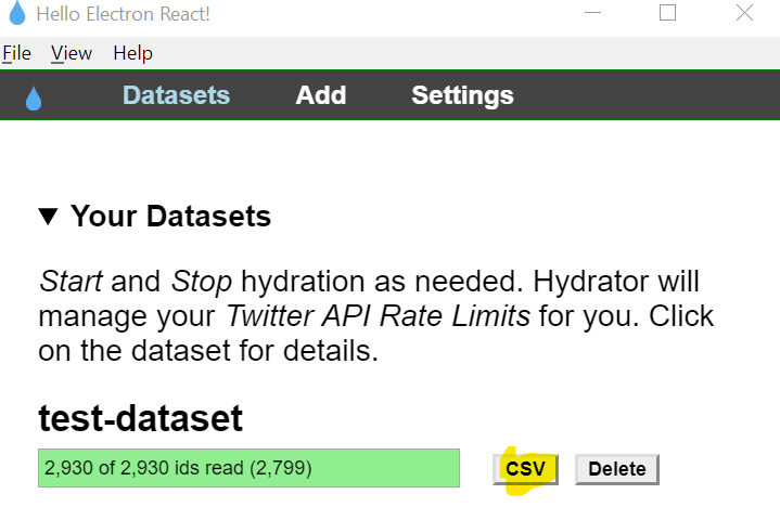 - Open the “ids.txt” file in Hydrator by adding it as a new dataset.