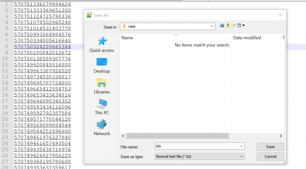 Step 4: in Nodepad++, save it as a new text file (letโs call it โids.txtโ; this file will include a list of unique tweet ids.