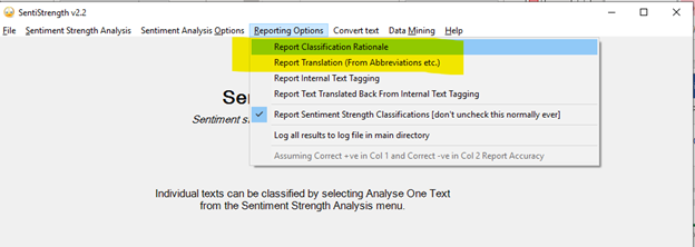 - In SentiStrength, uncheck the following two reporting options: “Classification Rationale” and “Translation” as shown below: