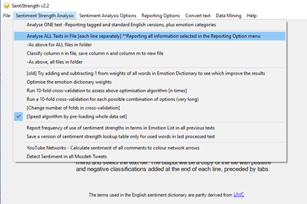 - In SentiStrength, run a sentiment analysis with the default options under “Sentiment Strength Analysis” -> “Analyse ALL Texts in File (each line separately)”.