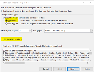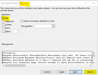 - Once the analysis is complete, open the resulting text file in Excel. If Excel opens the Text Import wizard, specify that you are working a tab-delimited file that has a header, as shown below: