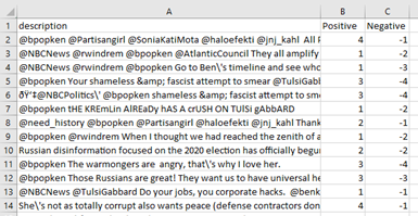 - If everything worked as intended, you will see a table with three columns: the original tweet, the positive polarity score (from 1 to 5) and the negative polarity score (from -1 to -5). Please note that tweets with scores (1 and -1) are considered to be neutral.