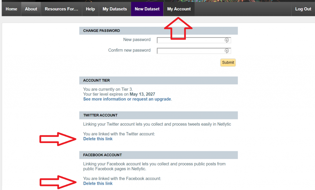 To unlink your social media account from Netlytic, please go to the “My Account” section of the website and click “Delete this link” as shown below: