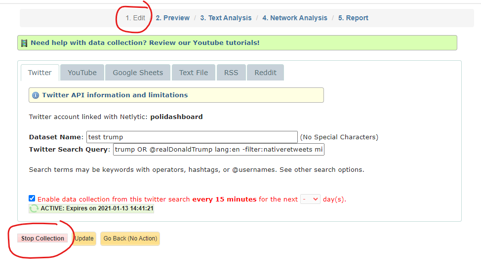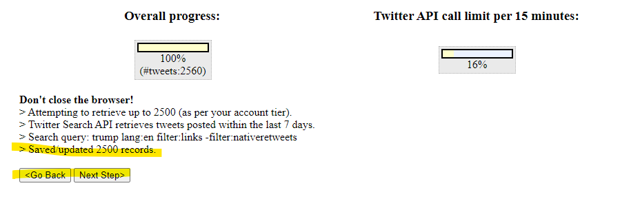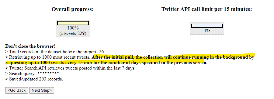 Once the screen shows the number of saved/updated records and the “Go Back” and “Next Step” buttons appear, it means that the initial “pull” is done and you can go to a different page. After this, the collection will continue to automatically run in the background by querying Twitter API every 15 minutes for the number of days that you have specified. You will receive an email once the live collection reaches the expiry date/time.