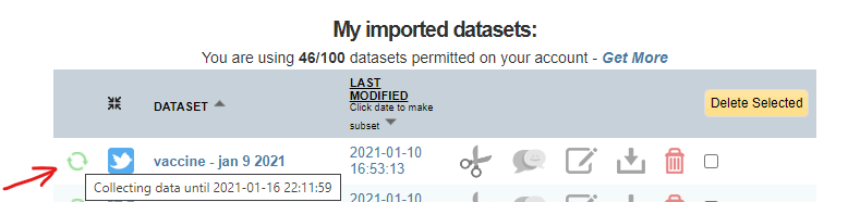 Please note that the live collection end date/time is based on when you started the collection. For example, if you started collecting tweets today at 3:14pm and set the collection to continue for 1 day, the end date/time for your collection will be next day at around 3:14pm. To confirm the end date/time, simply mouse over the live collection icon next to the dataset under the My Datasets page (see below).