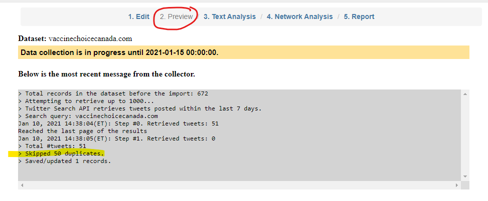 - For live collections, you can also see the latest log message from the collector about the number of tweets that have been retrieved during the most recent call to Twitter API. This detailed message is available in the Preview step of a selected dataset.