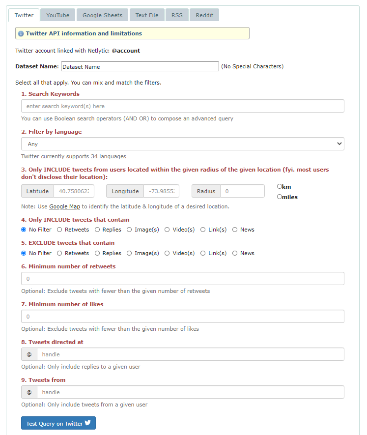- Netlytic also makes it easier to restrict your collection to only tweets from users located within the given radius of a given location. This is useful to track breaking news or live events and incidents occurring in real time. In Netlytic, the location-based filter is labelled as #3 in Netlytic’s new Twitter data collection form for Twitter data:
