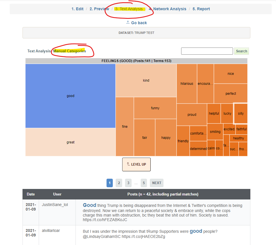 In the example below, the second post (third row in the table) has been classified under the “feelings (good)” category because it contains the word “nice”, which happened to be one of the dictionary words listed/entered in the “feelings (good)” category.