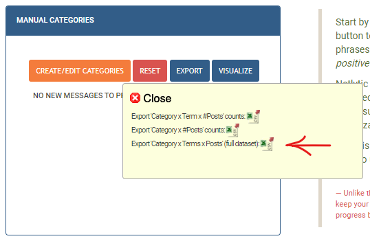 When analyzing a dataset using content categories that you created under the Text Analysis step called “Dictionaries (Manual Categories)”, you can now export a labelled dataset as a CSV file, which will contain the original dataset + two additional columns: “category” and “terms” (see the screenshots below):