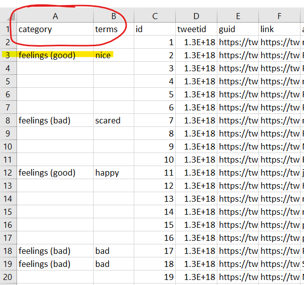 - The “terms” column will list one or more relevant keywords or phrases found in the post that also correspond to the category listed in the “category” column.