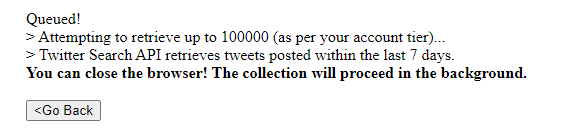 Because Tier 3 accounts permit collection of up to 100k recent tweets (posted within the past 7 days), the collection will automatically proceed in the background. You will see the following message confirming that the collection has been queued and that it is safe to close the browser or go to a different page.