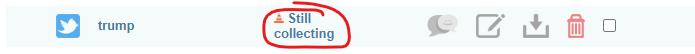 During the collection process on the My Datasets page, you will see a note indicating that tweets are still being collected (as shown in the screenshot below). You can click on this message to see the progress.