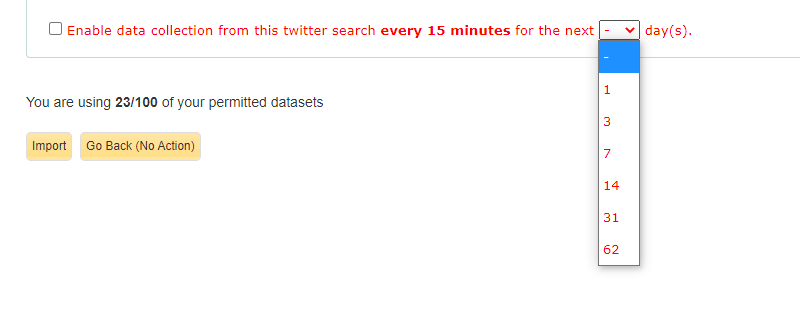 If you have a Tier 3 account and you want to collect data using the “Live Tweet” mode of data collection, click on the “Enable data collection …” checkbox when you are creating a new dataset and specify the time period for data collection (between 1 to 62 days) as shown below.