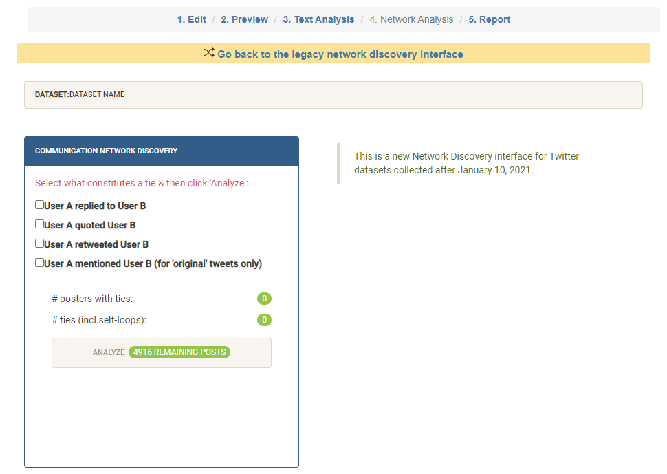 - Finally, for new Twitter datasets, we’ve simplified the network discovery interface. It now gives you four distinct options to connect users found in your datasets as shown in the screenshot below.