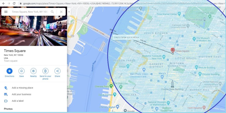 - This option will allow you to drag and drop a line from the original point on the map as far as you intend to collect tweets from. In the case of our previous example, 2km would cover the area from Times Square to Hudson River, and from Times Square to Hudson River on the other side of Manhattan island. Important: To cover the whole island of Manhattan, you will have to create multiple datasets with different central points.
