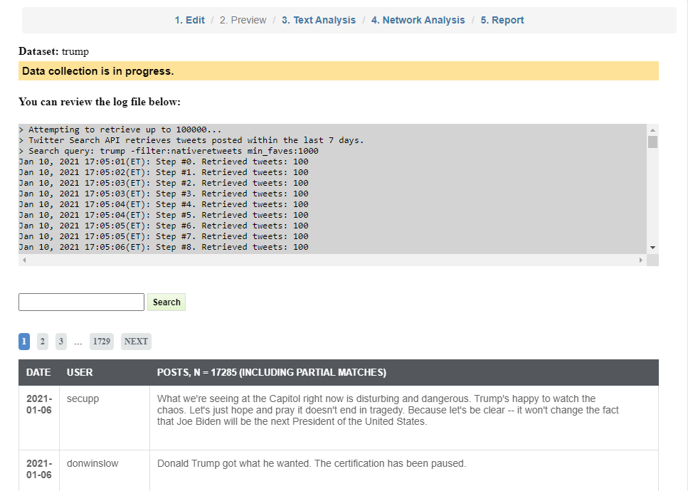 If some tweets have already been collected, the Preview step of the dataset will display a searchable table with the collected records (see below). Important: It is safe to do a preliminary exploration and analysis of tweets that have already been collected, even if the collection is still ongoing. However, if you do any exploratory (text or network analysis) before data collection is complete, you will need to rerun them again once data collection is complete.